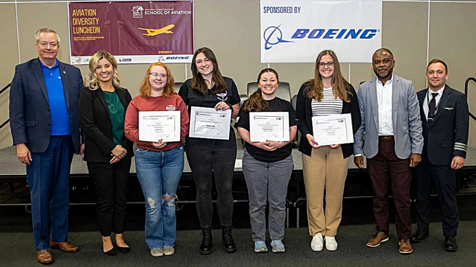 This is the second consecutive year Boeing has provided $50,000 to the School of Aviation for scholarships and to fund activities of aviation-related registered student organizations and outreach events, such as the fourth annual diversity luncheon on April 12 at the Glenn Poshard Transportation Education Center. Five students each in aviation technologies, aviation flight and aviation management received $2,000 scholarships and the remaining $20,000 is split between registered student organization (RSO) activities and diversity outreach programs.