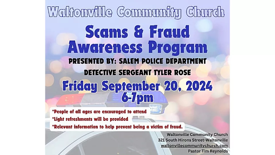 WALTONVILLE – A Scams and Fraud Awareness Program will be held Friday night at 6 at the Waltonville Community Church on South Hirons Street.