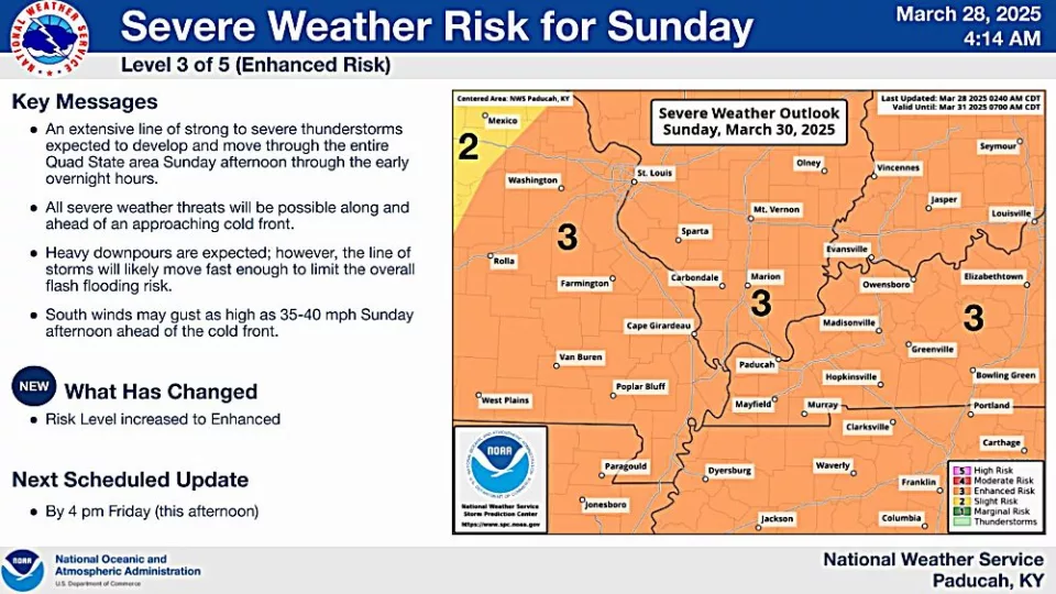 SOUTHERN ILLINOIS – The National Weather Service in Paducah says the severe weather threat level four our area has increased for Sunday with all modes of severe weather possible. We are now in an enhanced risk for severe weather.