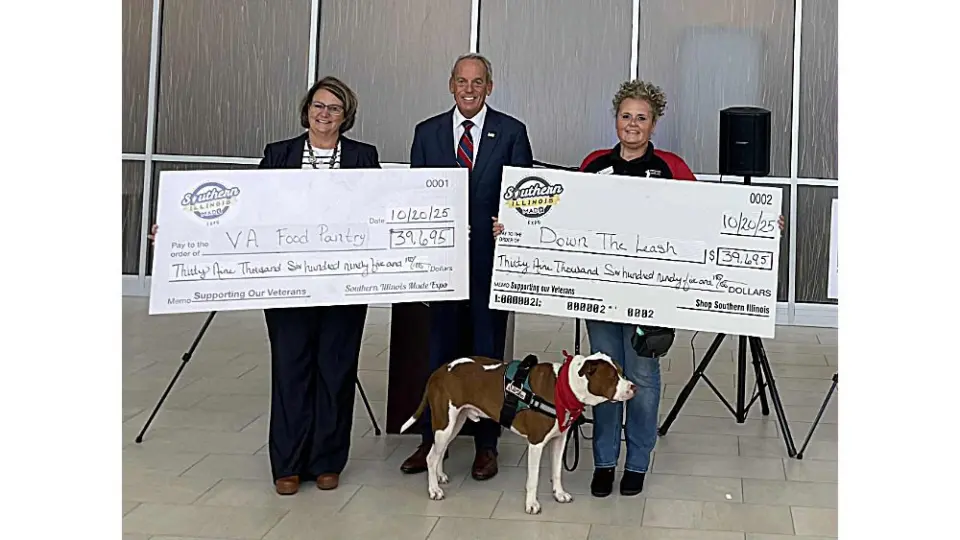 MARION – Down the Leash and the Marion VA Food Pantry each received over $39,000 from proceeds raised at this year’s Southern Illinois Made Expo during a check presentation Monday at Veterans Airport of Southern Illinois in Marion.