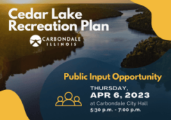 CARBONDALE – The City of Carbondale invites you to attend an update on the Cedar Lake Recreation Plan and contribute your feedback toward upcoming revisions Thursday from 5:30 to 7 p.m. at City Hall on South Illinois Avenue.